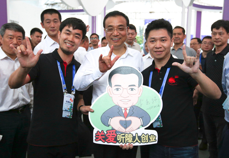 2016年10月12日下午全國雙創周深圳主會場上動人的一幕。李克強對這一創業團隊給予特殊關注,并應邀在“關愛聽障人創業”畫板上簽上自己的名字。(資料圖)
