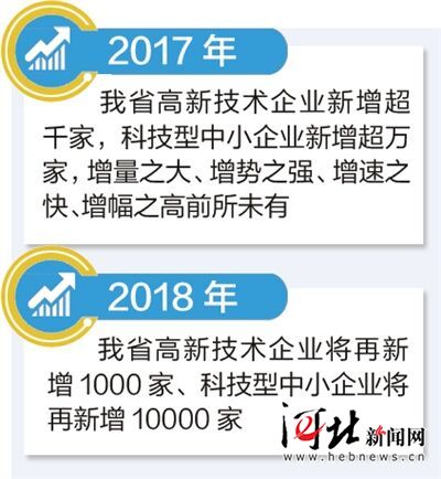 河北新聞網訊(記者郭偉)2018年河北省高新技術企業和科技型中小企業將分別再新增1000家、10000家。記者從2月5日召開的全省科技工作會議上獲悉,到今年底,河北省高新技術企業將超過4000家,科技型中小企業將達到62000家。