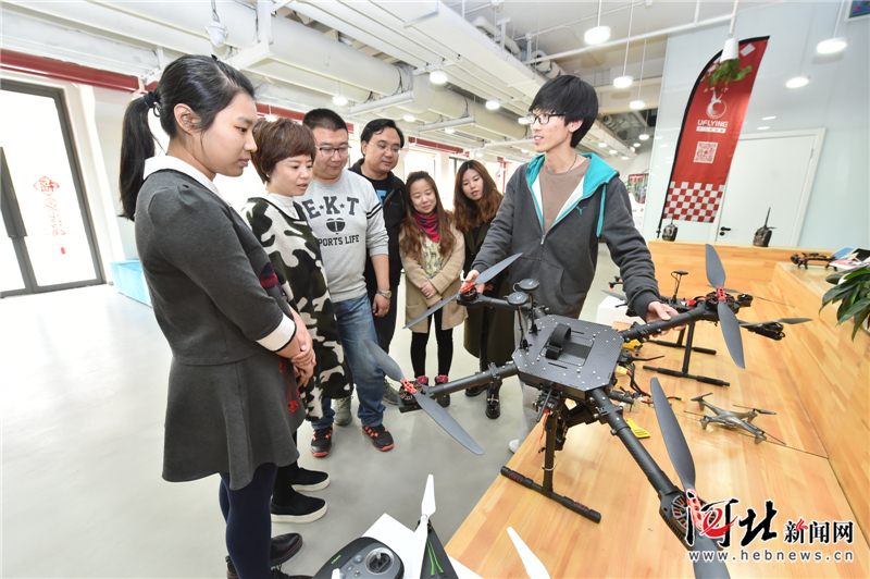 香河縣中信國安創(chuàng)客空間,創(chuàng)業(yè)者(右一)正向參觀者介紹自主研發(fā)的多旋翼無人機。記者霍艷恩攝