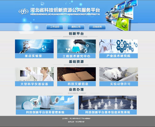 2015年12月15日,由科技廳設(shè)計開發(fā)的“河北省科技創(chuàng)新資源公共服務(wù)平臺”網(wǎng)站正式開通。該網(wǎng)站作為河北省科學(xué)技術(shù)廳廳網(wǎng)下屬二級網(wǎng)站,以科技創(chuàng)新平臺和科技創(chuàng)新資源統(tǒng)籌為重點(diǎn),系統(tǒng)整合了省級以上重點(diǎn)實(shí)驗(yàn)室、工程技術(shù)研究中心、產(chǎn)業(yè)技術(shù)研究院、大型科學(xué)儀器設(shè)備共享服務(wù)、科技文獻(xiàn)服務(wù)、實(shí)驗(yàn)動物行政許可等分散在不同工作體系的服務(wù)功能和相關(guān)信息,集中公開展示科技創(chuàng)新平臺工作動態(tài)、通知公告、政策法規(guī)和已建重點(diǎn)實(shí)驗(yàn)室、工程技術(shù)研究中心、產(chǎn)業(yè)技術(shù)研究院基本信息及實(shí)驗(yàn)動物生產(chǎn)許可、使用許可信息,并鏈接河北省大型科學(xué)儀器資源共享服務(wù)聯(lián)盟、科技文獻(xiàn)服務(wù)網(wǎng)和科技創(chuàng)新平臺業(yè)務(wù)管理系統(tǒng)。