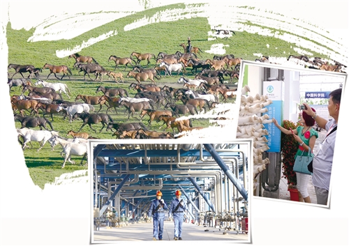 左上圖 馬的生產(chǎn)關(guān)鍵技術(shù)研究與示范項(xiàng)目是新疆“十二五”重大科技專項(xiàng),參與該項(xiàng)目的牧民獲益是原來(lái)收入的5倍以上。圖為新疆昭蘇馬場(chǎng)培育的馬群。(資料圖片)